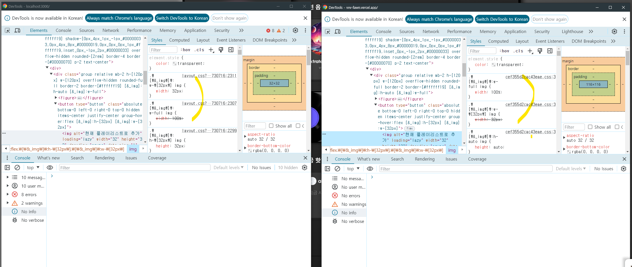 왼쪽은 개발서버, 오른쪽은 배포 서버인데 같은 코드임에도 다른게 보여졌다.