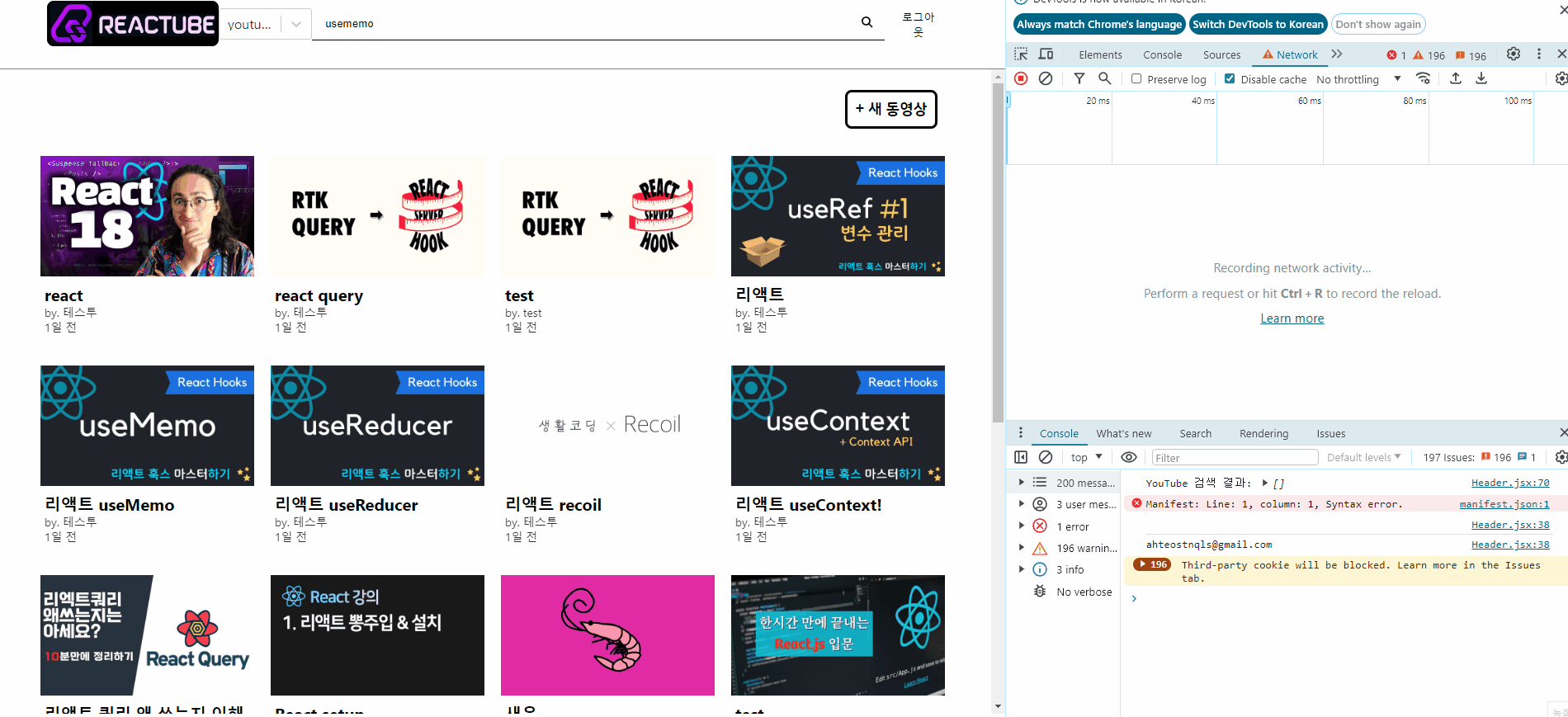 이번 프로젝트는 유튜브 api를 사용하여 추천 영상을 등록하고, 검색하는 프로젝트를 진행하였다.